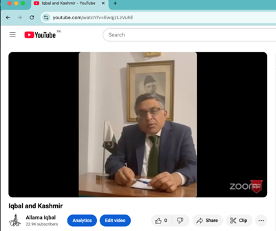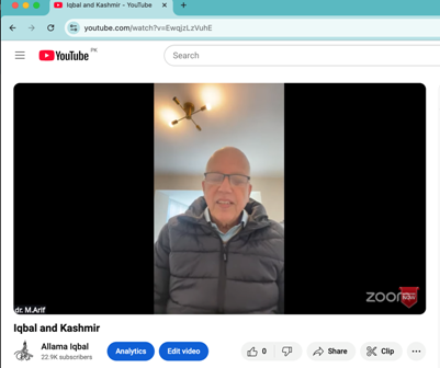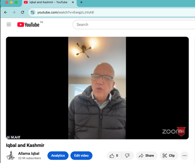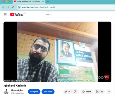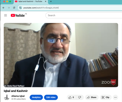 "I Witnessed Nature Unveiled in Srinagar" (Allama Iqbal) Iqbal Academy Pakistan, Lahore (February 18, 2025) – In connection with Kashmir Solidarity Day (February 5), Iqbal Academy Pakistan organized a webinar to highlight the significance of Kashmir's freedom movement. The session was presided over by renowned Iqbal scholar Dr. Muhammad Arif Khan from the UK. Distinguished speakers included Dr. Zahoor Ahmad, Pakistan’s Ambassador in Spain; Dr. Arif Mahmood Kisaaa, Chairman of Iqbal Academy Scandinavia (Sweden); Rana Muhammad Ijaz from Kuwait; Dr. Khalid Latif from the Iqbal Institute at Kashmir University, Srinagar; and Dr. Ijaz Lone, a well-known Kashmiri intellectual from Malaysia. The speakers emphasized that Allama Iqbal initiated the ideological foundation of Kashmir's independence movement. Pakistanis and Kashmiris worldwide continue to support this cause diplomatically, and this webinar was part of those ongoing efforts. Participants and speakers from both the East and the West joined to discuss and reaffirm their commitment to Kashmir's cause. At the end of the event, Dr. Abdul Rauf Rafiqi, Director of Iqbal Academy Pakistan, expressed gratitude to all speakers and attendees. The lecture was broadcast live on Zoom as well as on the Iqbal Academy’s YouTube channel (youtube.com/iqbalacademy). The webinar attracted audiences from Pakistan, Malaysia, Indonesia, Spain, Sweden, the UK, and the United Arab Emirates, who participated online in this significant discussion.