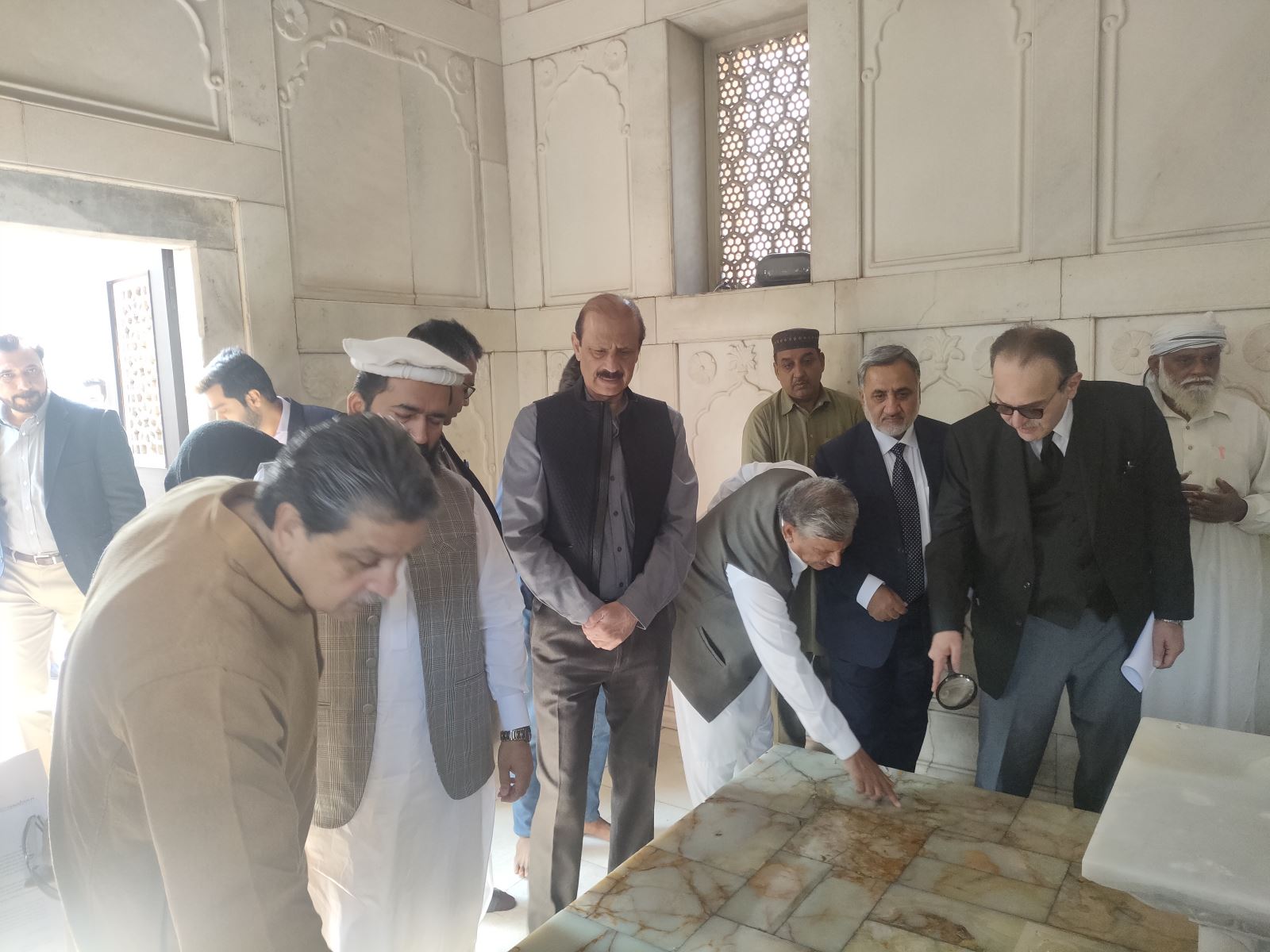 A meeting of the Mazar-e-Iqbal conservation and renovation committee was held on 22th November, 2023 under the chairmanship of Senior Member Board of Revenue Mr. Nabil Javed. In the meeting, Director Iqbal Academy Pakistan Dr. Abdul Rauf Rafiuqi, Grandson’s Iqbal Mr. Muneeb Iqbal, Mian Iqbal Salahuddin, DG Walled City Kamran Lashari, Secretary Awqaf Dr. Tahir Raza Bukhari, Deputy Secretary Chief Minister Office, Khatib Badshahi Masjid Mr. Abdul Khabeer, and other officers. attended. Committee members attended Mazar-e-Iqbal and recited Fatiha. Mr. Nabil Javed said that the historical and cultural importance of Mazar-e-Iqbal is well understood.